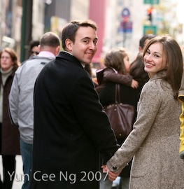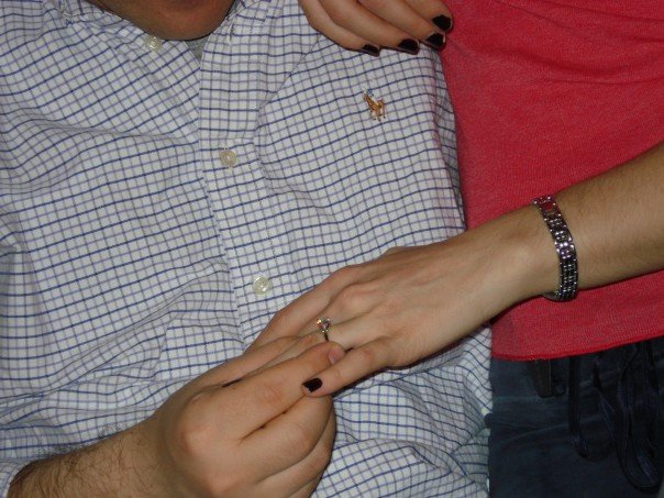 Paul asked Grandma Lola, Diana's 99-yr old grandmother, to be an accomplise in his proposal. Grandma called Diana up two nights before the day Paul proposed and asked her to come over for dinner because "she was so lonely." Diana never said no to Grandma for dinner throughout all four years of college. So, even though she was swamped with work, she went over in her usual non-glamorous engineering fashion--jeans and a t-shirt. Diana was greeted at the door by a frantic Grandma Lola doing her typical song and dance about how Diana was late and how the food was burnt. She told Diana to hurry up and go wash her hands in the back. As she passed through the living room, she noticed that there were three place settings for dinner. Diana momentarily freaked out because she assumed Grandma knew that Paul couldn't make it for dinner and didn't want to hear Grandma complain about slaving in the kitchen for Paul when he wasn't there. Diana reached for her cell phone while walking and started to call Paul. Her jaw dropped as she got to the back room to wash up because she was calling Paul, but Paul was standing in front of her! Her face went from suprise to confusion. Then before Diana could ask what was going on, Paul pulled out a little black box and got down on one knee. He said very sweetly, "Diana, Will you marry me?" as he opened the box. Diana started to cry and say "YES! Of course! yes yes yes- Oh my god thats gorgeouuusss!!" and gave him a kiss as tears streamed down her face. They tried calling a bunch of relatives but couldn't reach anyone! Grandma Lola yelled that the food was getting cold- so they took calls as they ate a delicious Veal Schnitzel that Grandma made and a glass of Austrian wine (well, Paul had 1.95 glasses because Diana took her two sips and gave her glass to Paul as usual). (FYI-They kept the bottle which now sits on their window sill in Jersey City next to a plant).